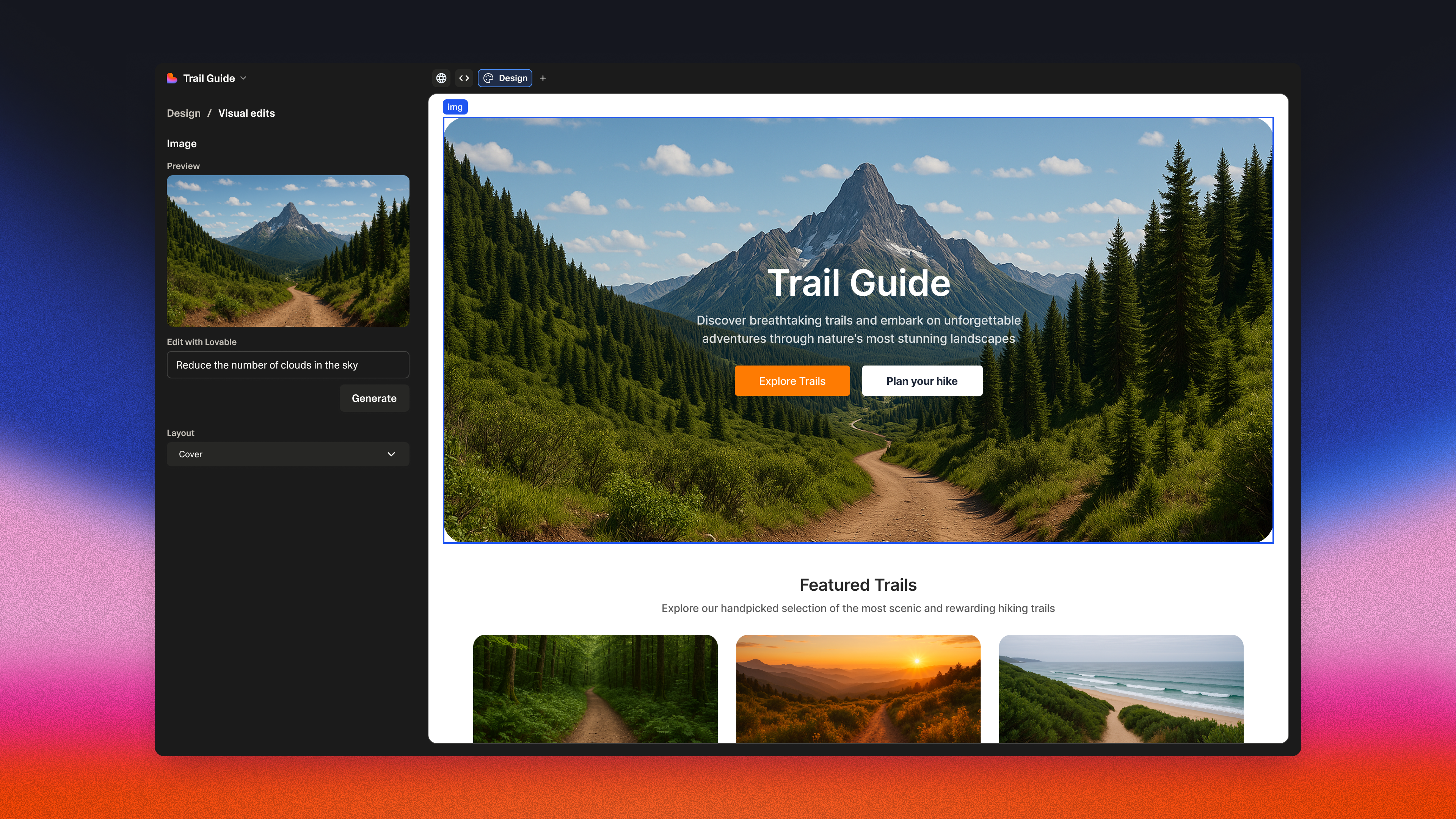 Edit and create new images with AI, so you can level up your apps without leaving Lovable or hunting for stock photos. Describe the image you want and let Lovable create it for you.